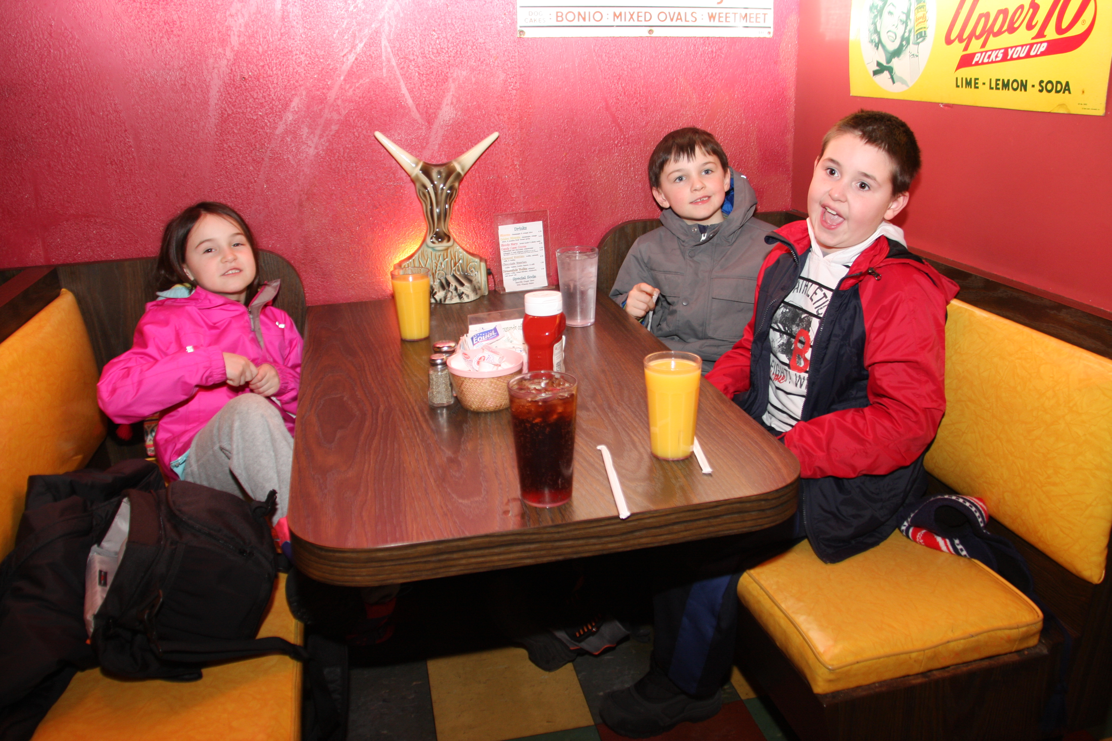 Everyone ended up getting pancakes except me; Emma gave up on her french toast idea. I got two orders of crispy bacon for everyone to share. Ben loves the bacon, and so do I. Emma and Ben had orange juice and Camden got a vanilla shake. I ate a club sandwich and drank half of my chocolate shake. We were stuffed but ready for action.