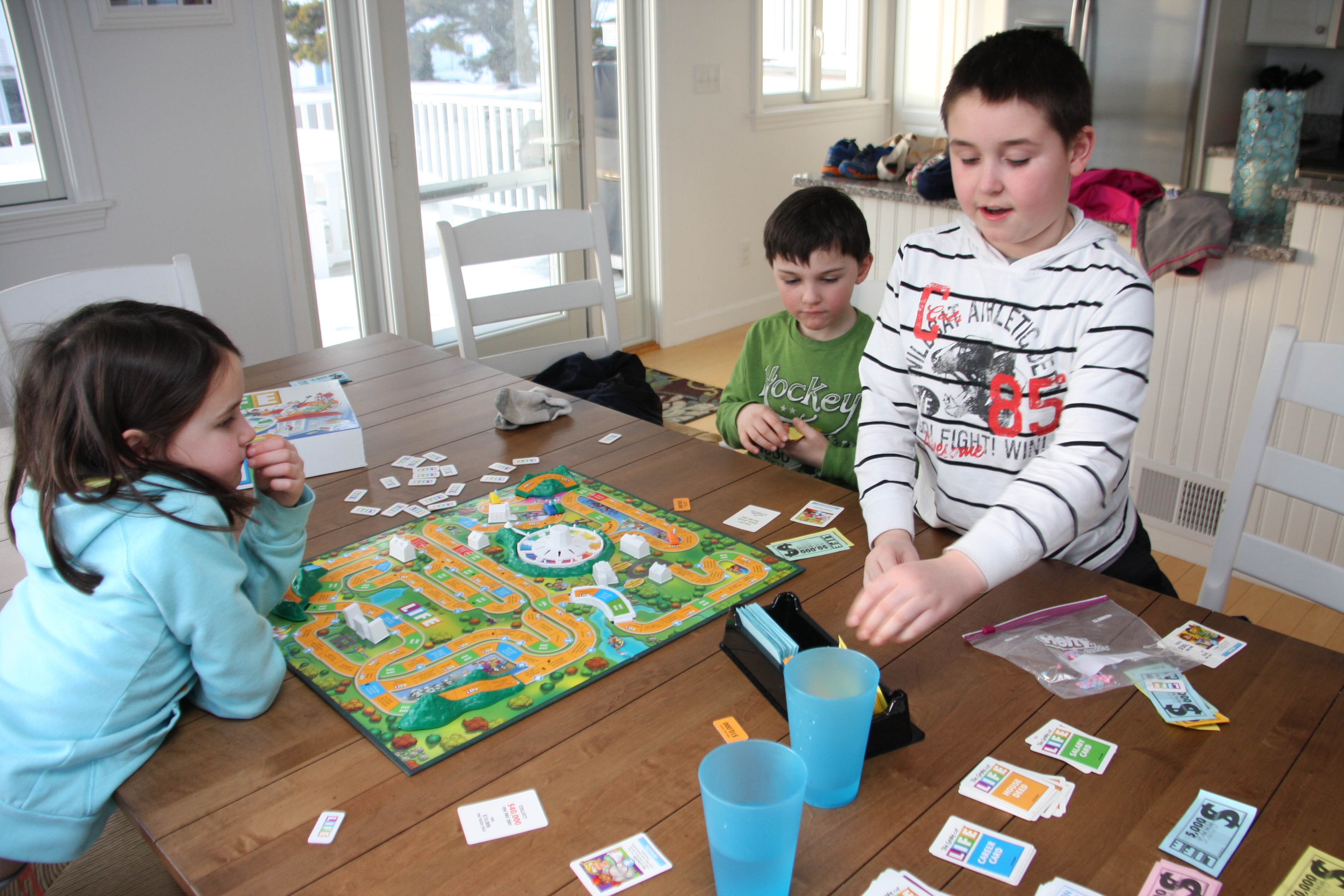 Next up was the final piece of the adventure – a quick trip to the beach house, now even more important because it would give us a way to dry wet clothes, turn up the heat, and bring everyone (especially Emma) back to normal. Ben reminded us about playing board games, selecting the game of Life and a sliding version of Sorry. You guys hadn’t visited the beach house since before Labor Day, so it was fun getting back. There was nothing to eat, so we passed out glasses of cold water which tasted great after our snow battles.