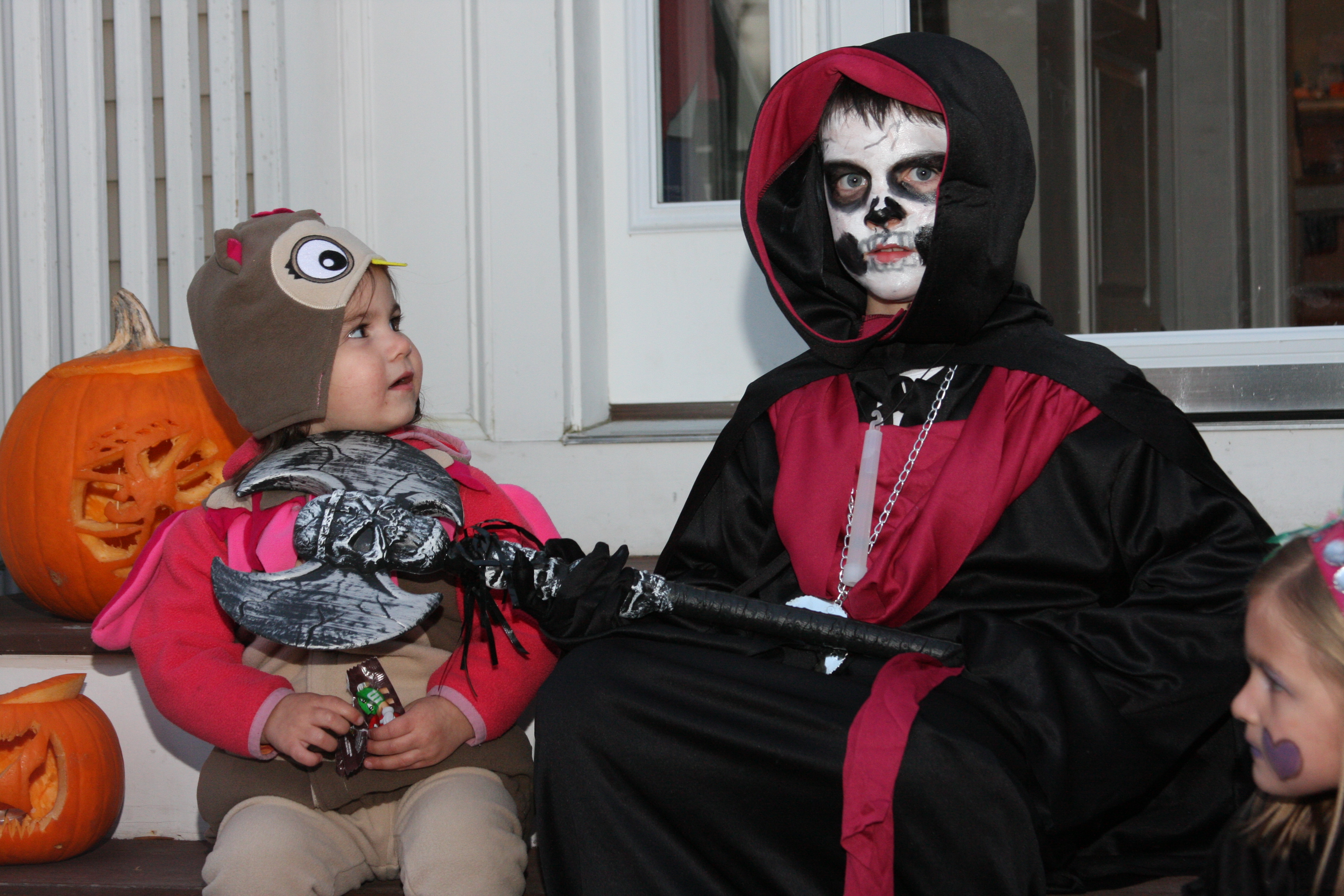 I like this picture of you on your front steps. You were in your own scary zone, doing your thing, within your own imagination, getting ready to Trick or Treat. I hadn’t asked you to pose. Madigan is taking it all in, look at her expression!