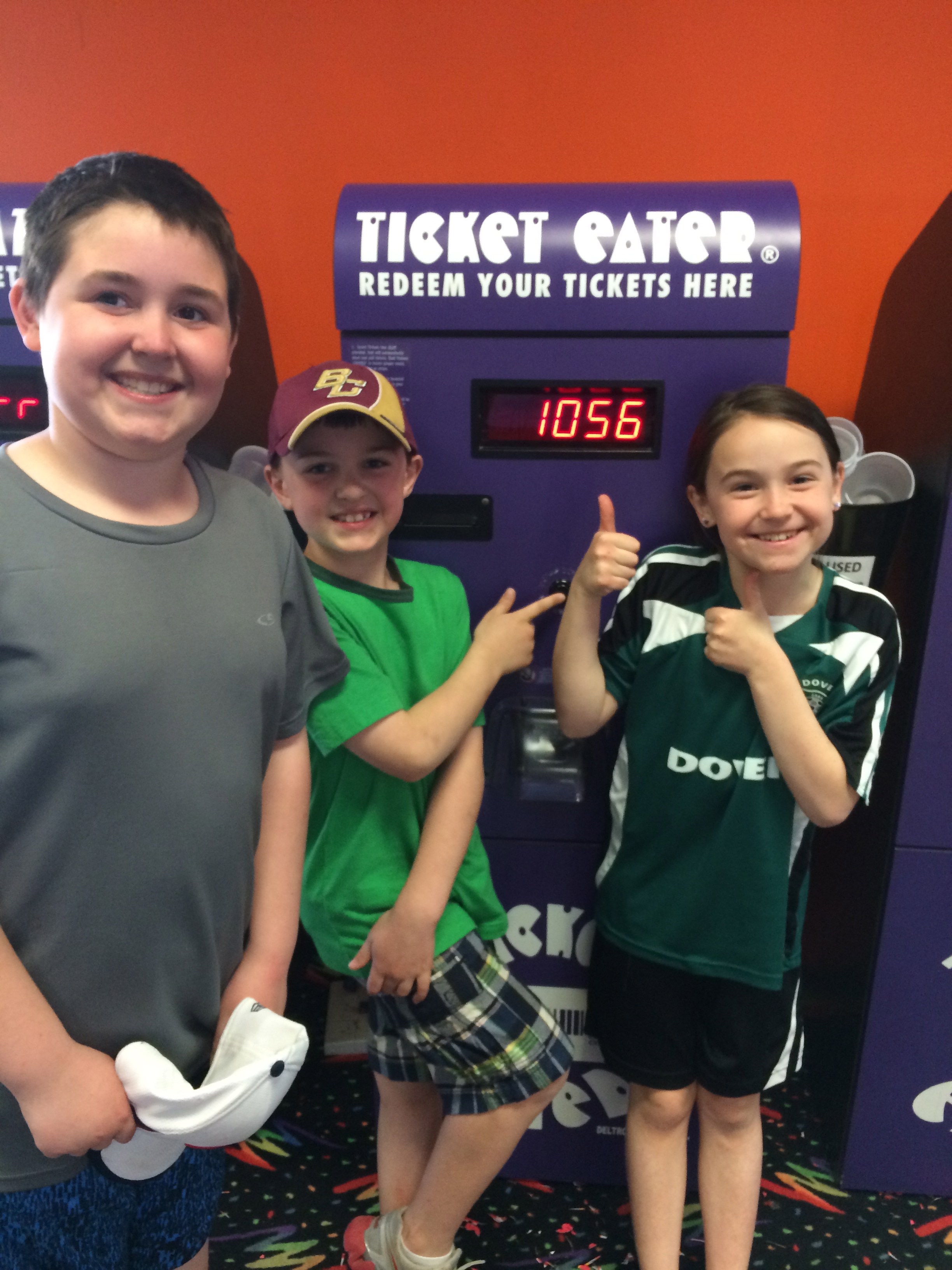 I wasn’t surprised when you asked, “Can we play some of the games?” We bounded inside and soon you were working hard, trying to win as many tickets as possible. Emma won the prize when her tickets just kept coming out and out and out and out! We were all laughing our heads off, there were so many!