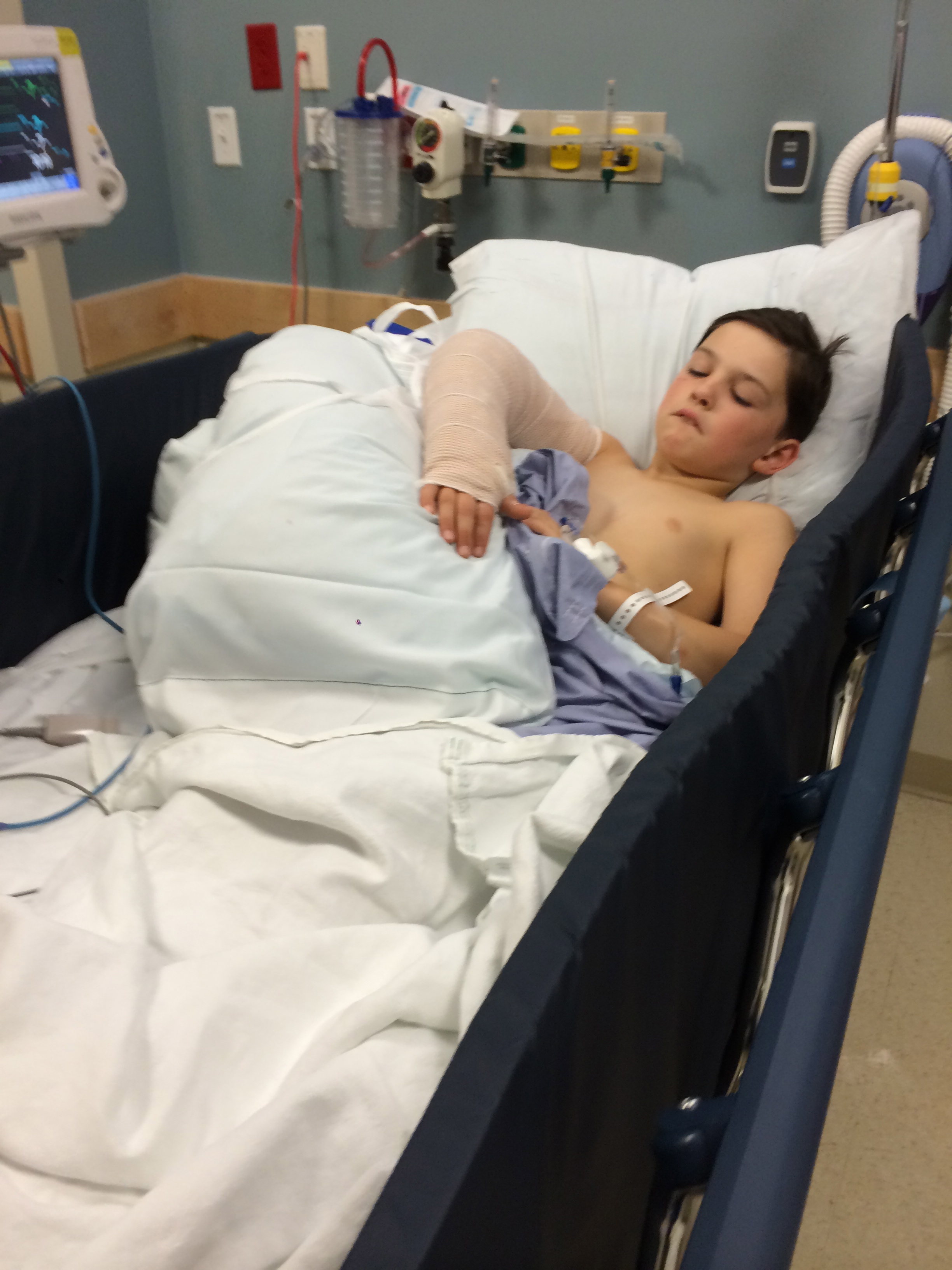 After what seemed like hours, you woke up and we visited you in your private post-op room. You looked so tiny in that big bed, and the cast around your arm seemed massive. Here’s a photo: