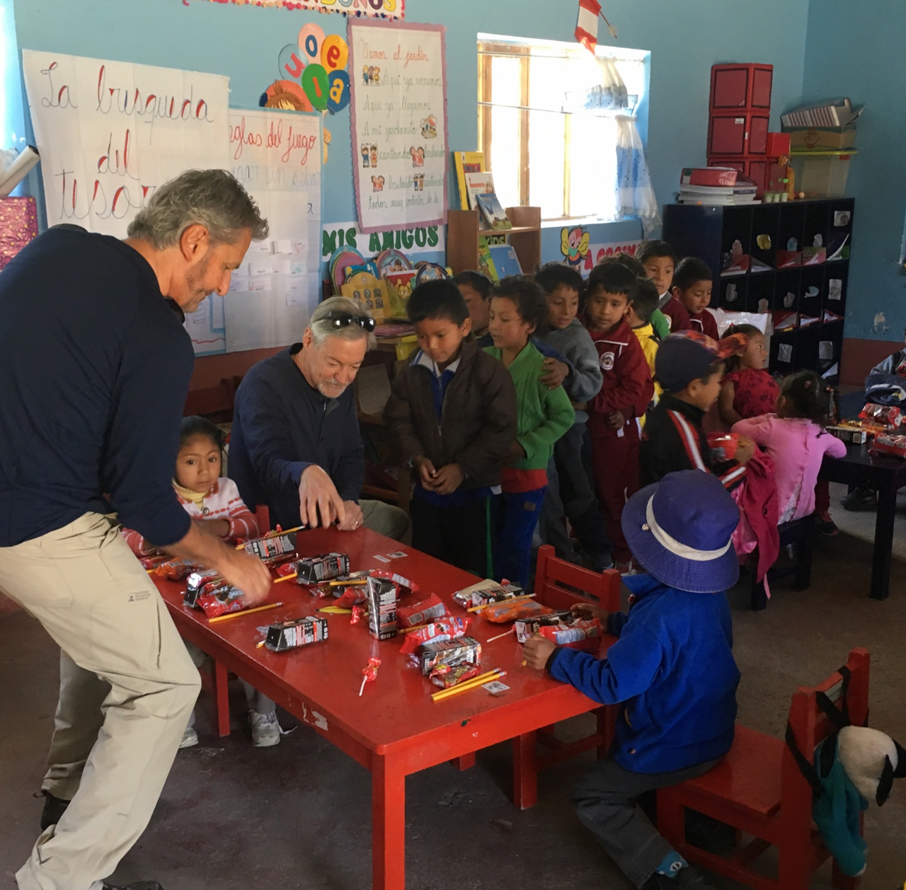 - bringing pencils, pens, notepads and candy to kindergarten and first graders (it was like Christmas for them) who couldn’t speak English; singing “Wheels on the bus” to them after they sang a song to us in Quechua, their native language