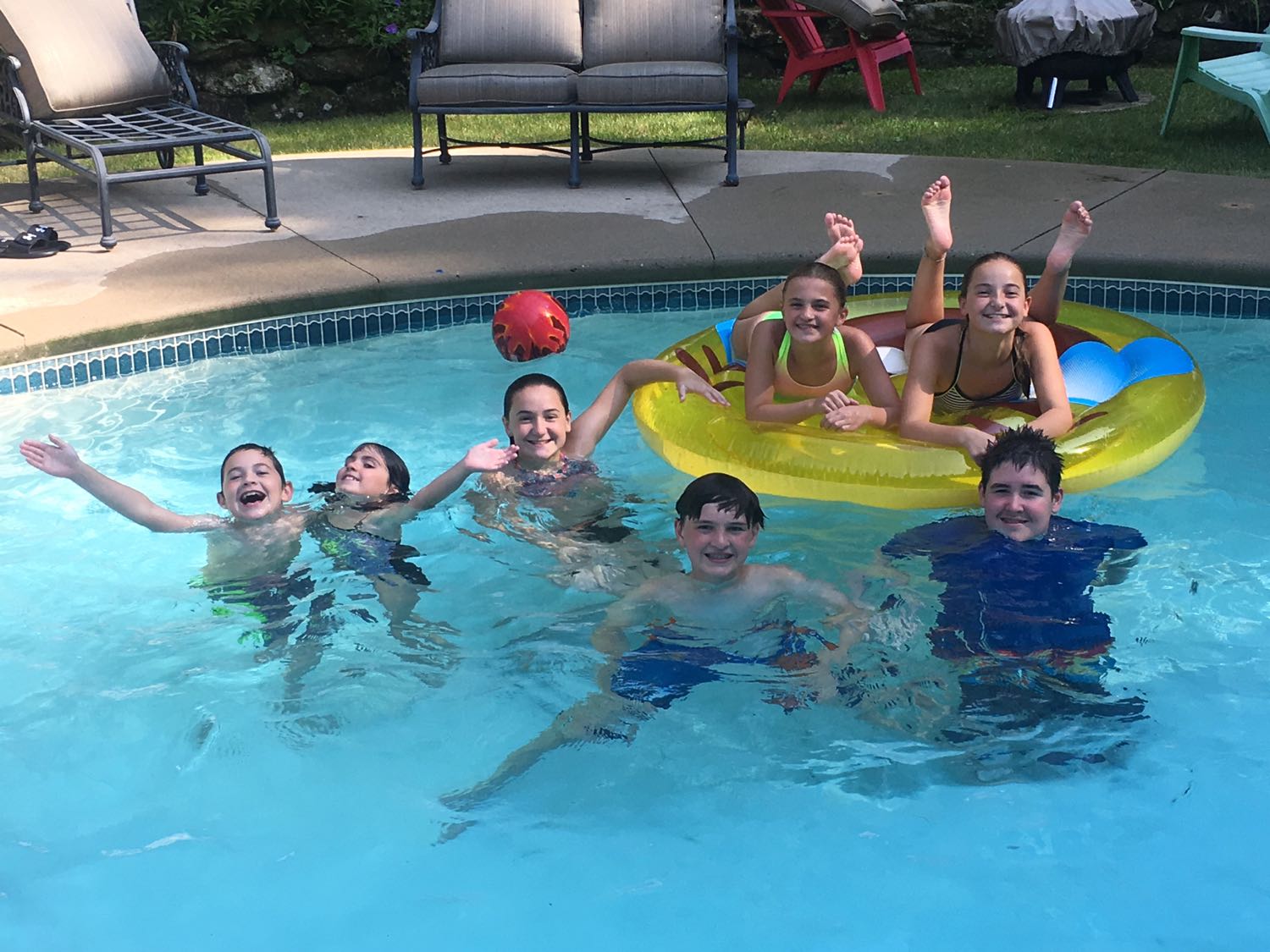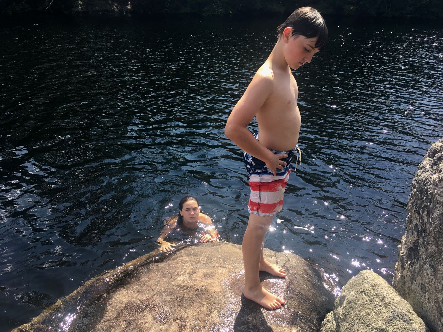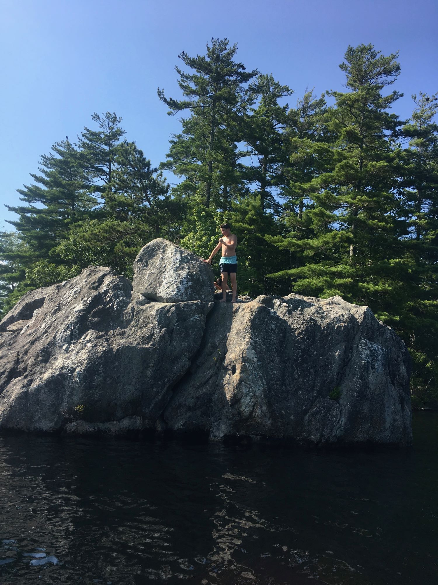 It took awhile to get out there. When we arrived, we discovered several big, granite boulders in the water, far enough off shore to potentially jump off. I was nervous – you’re never sure what’s under the water and I didn’t want any injuries to my beloved grandkids. The water looked deep and dark but I needed to make sure. I held my breath and went straight down to see if I could touch my feet – it was way over my head. The sun was hot and the dew point was in the 70’s, a very humid day. You were itching to get into the water.
