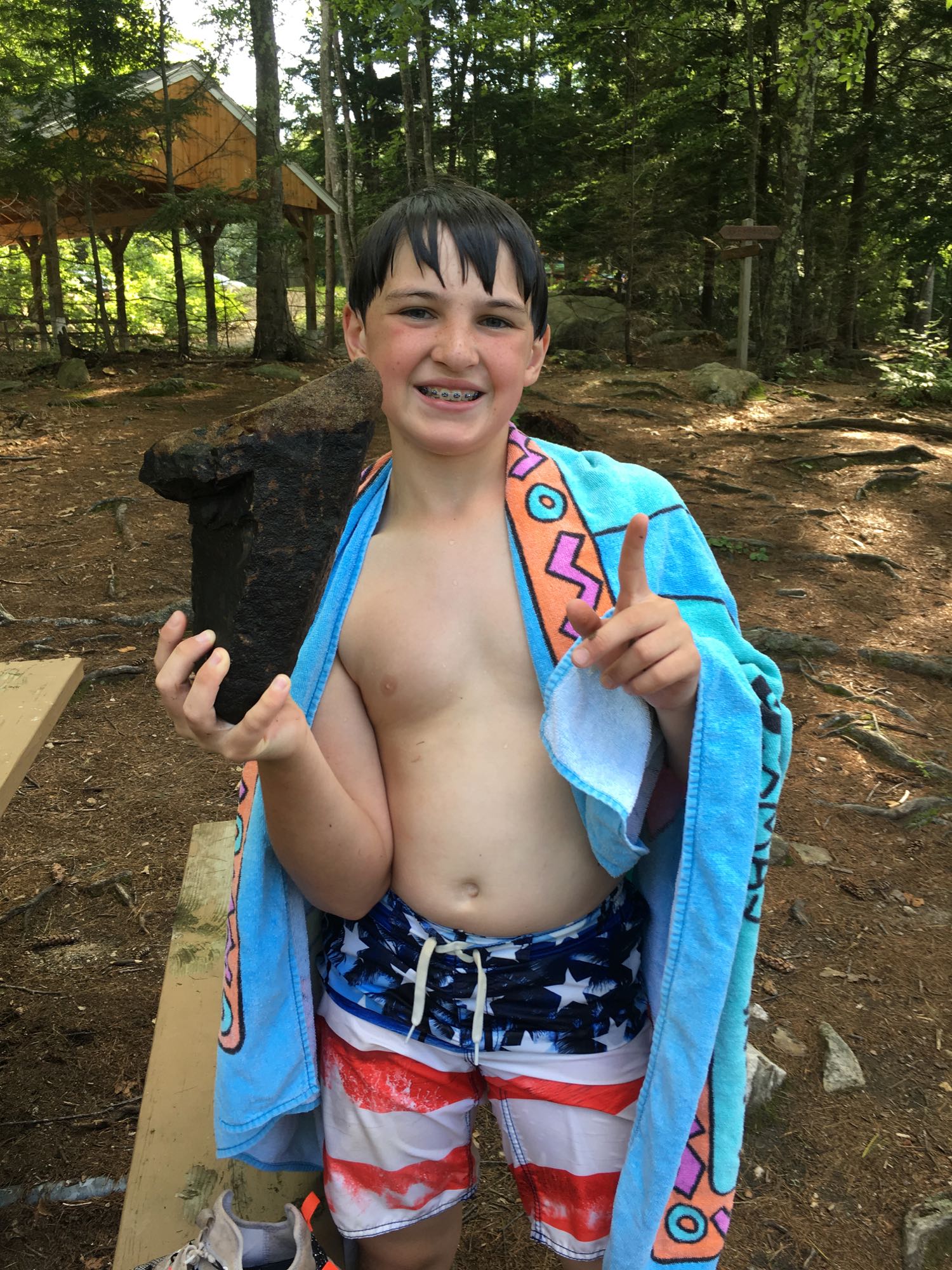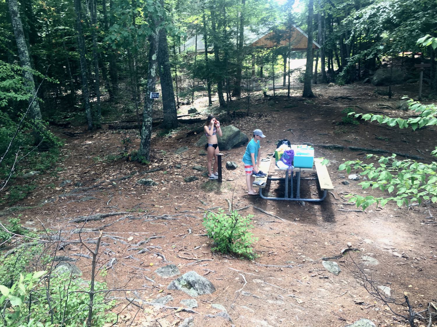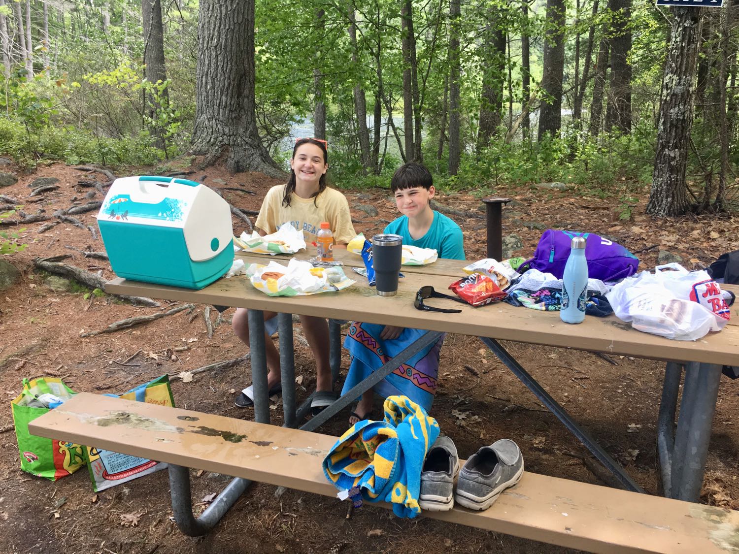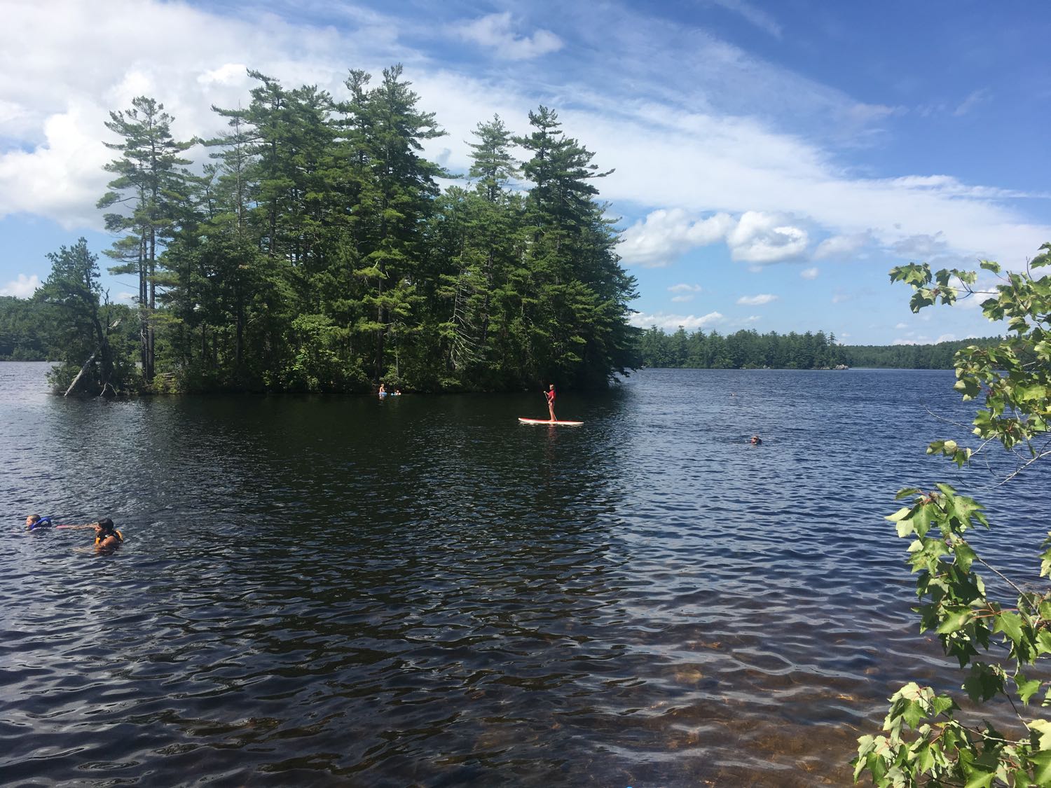 The word “pond” is a misnomer – Mendum’s is a good sized lake, one of the clearest, cleanest in the state. No wonder why it’s the summer outing location for UNH. We hiked the dirt road in, grabbed a picnic table, dropped off our gear and jumped into the water. The temp was Goldilocks perfect – not too cold or too warm, just right. We swam around the edge of the lake, climbed on some rocks and went by a couple docks.