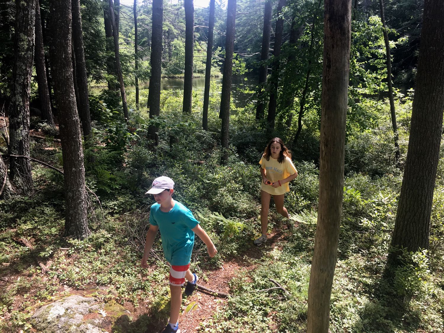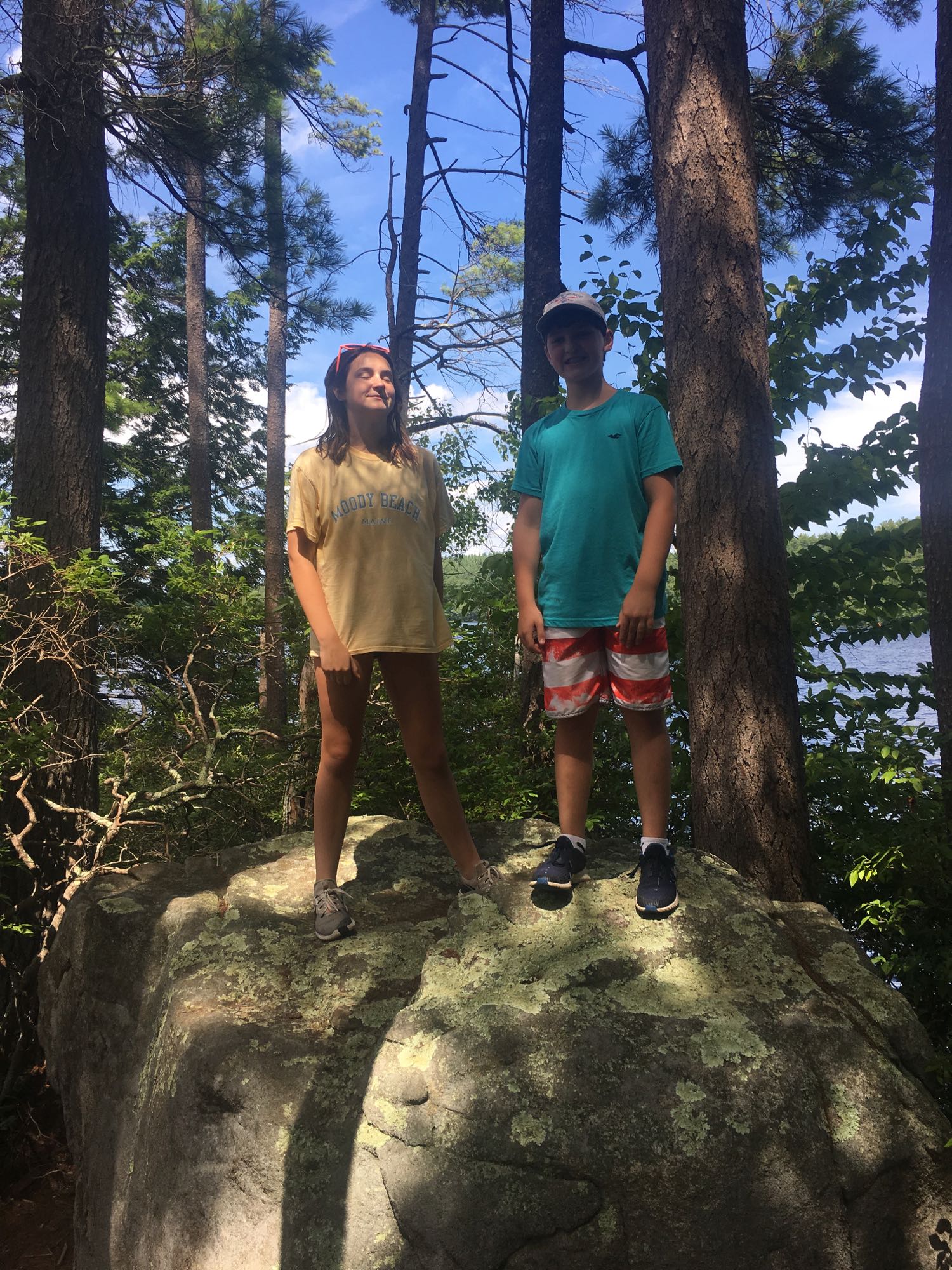 We noticed a large boulder far away in the water. “It would be cool to check that out,” Camden said. “Yeah!,” Emma said. Our bare feet walked on soft pine needles (and some poison ivy – I later discovered) to the rental building. Our choices: canoes; individual kayaks, tandem kayaks and paddle boards.