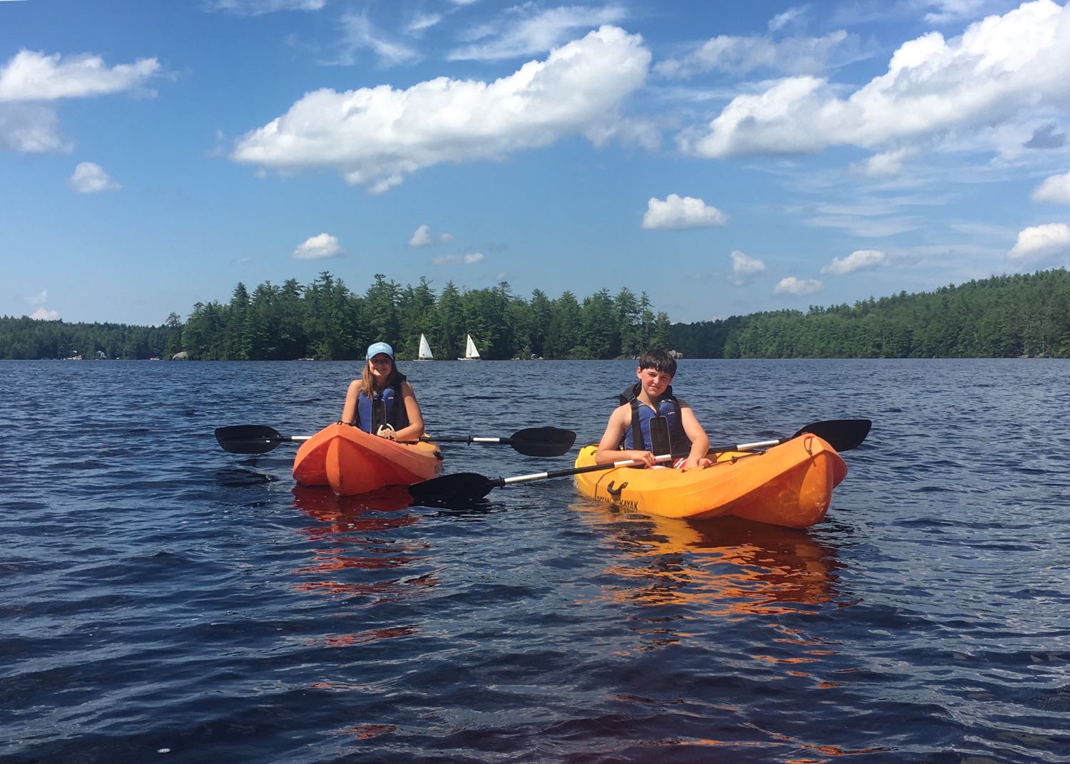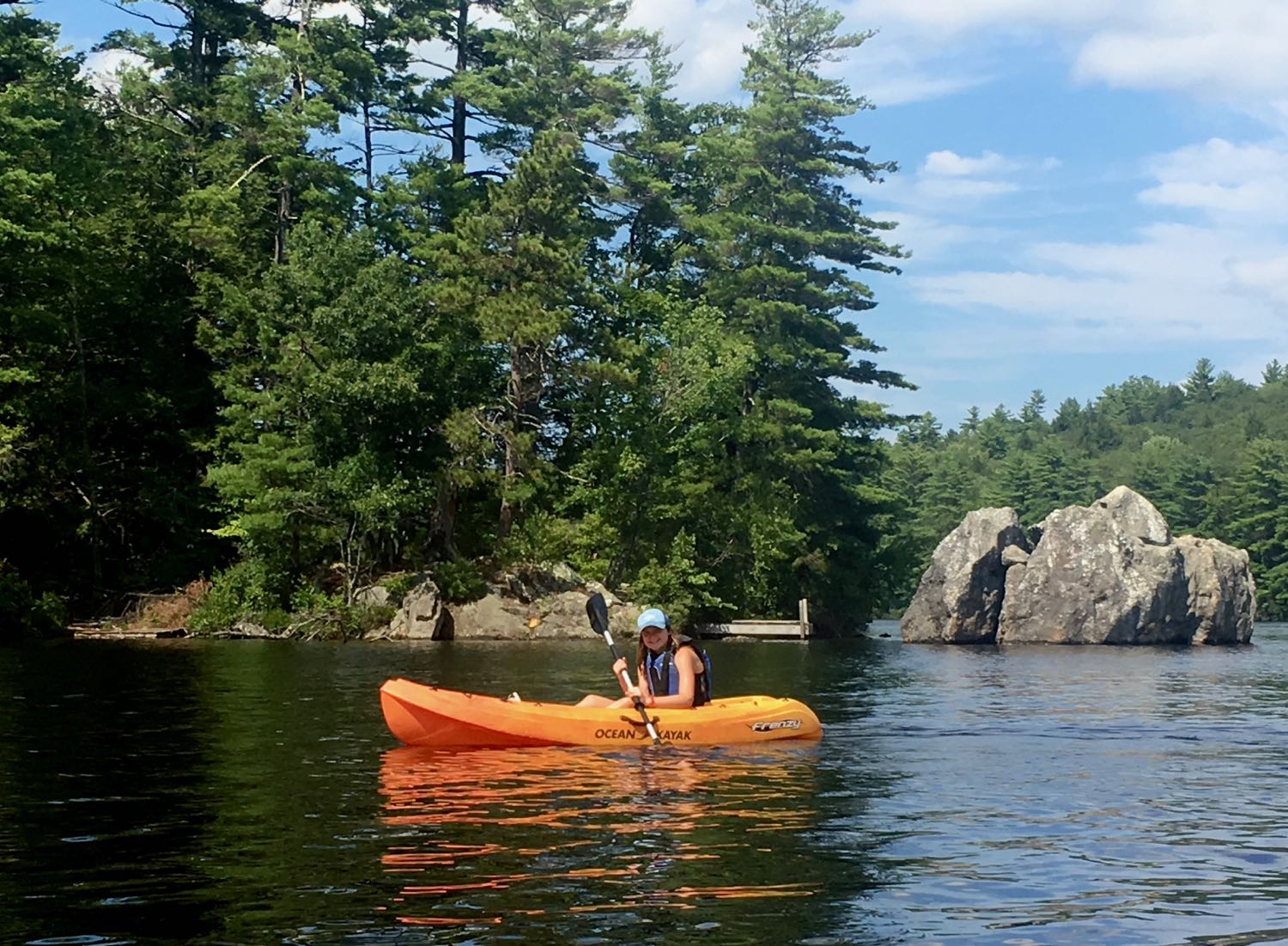 Our third mode of transportation worked best – individual kayaks. They were easy to paddle with little danger of flipping. As our confidence grew, we looked beyond the shore to distant locations along Mendum’s Pond. “Let’s paddle out to that giant boulder” Camden asked. Emma said, “Let’s do it!” Our energy was back and we were ready to burn calories.