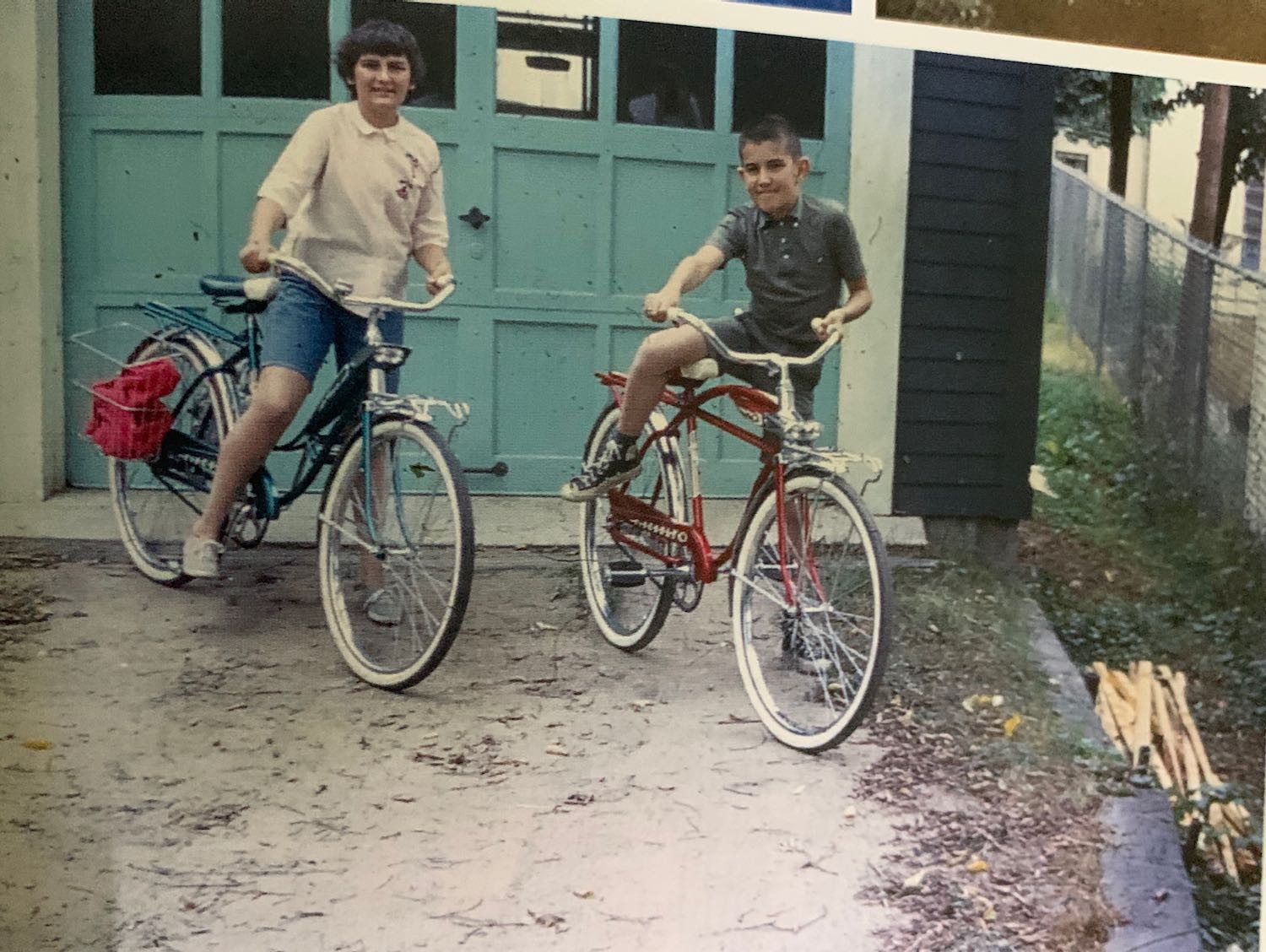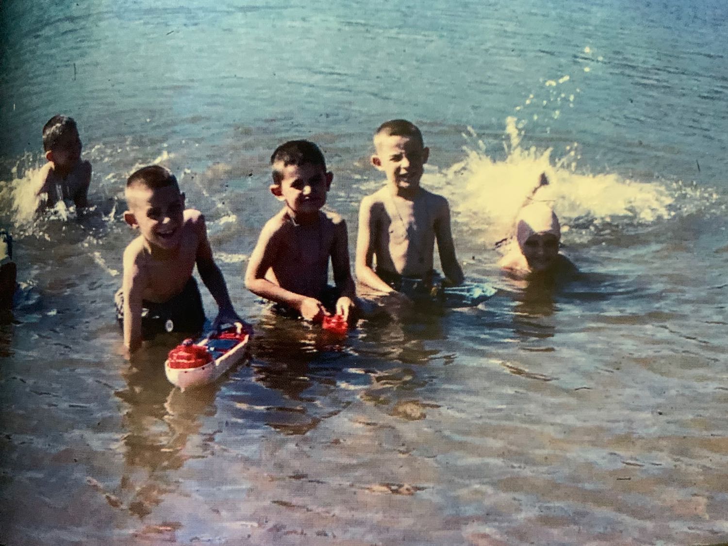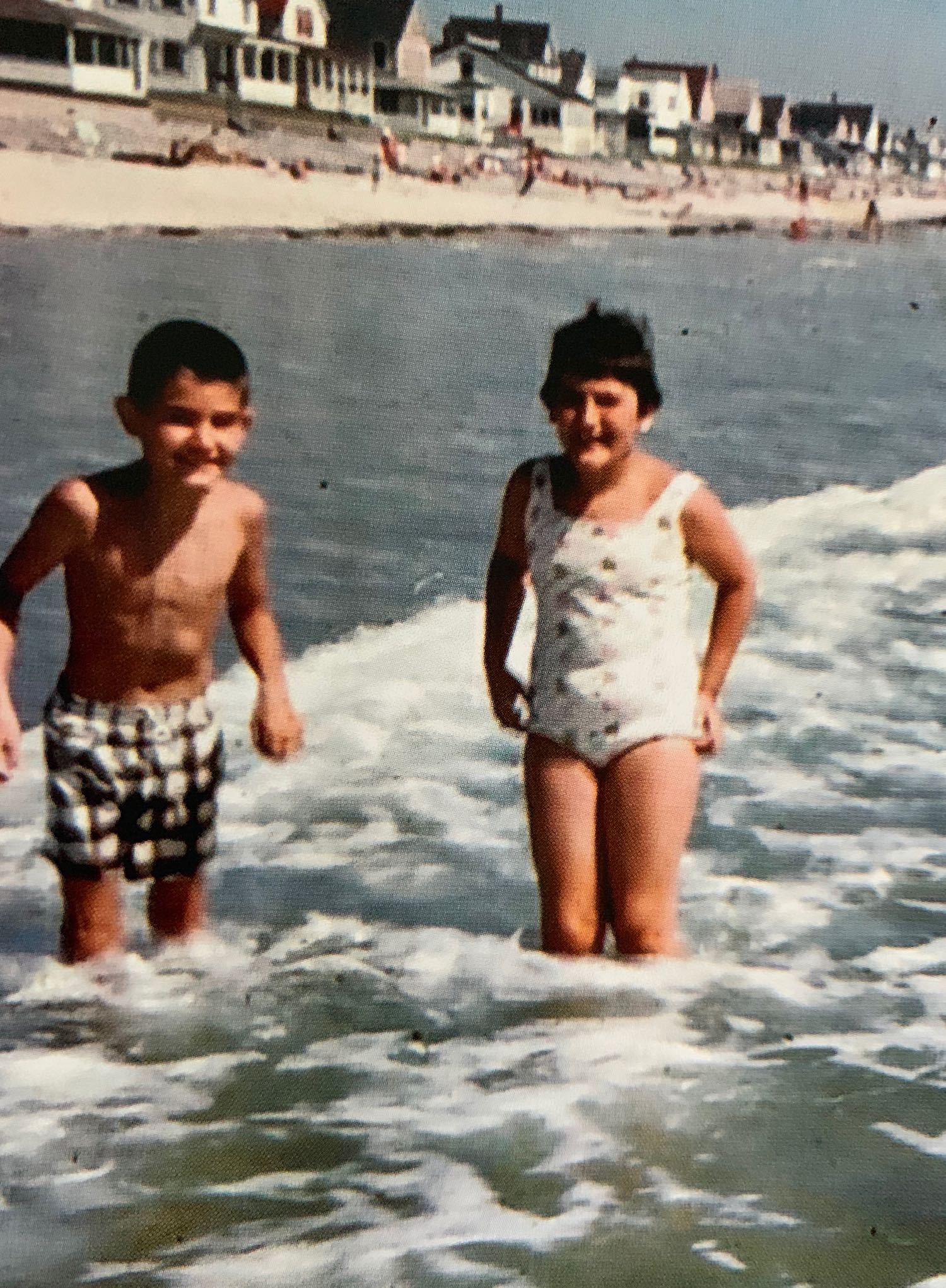 Below: first photo: at Echo Lake in North Conway…me in the middle, Paul left with boat, Marc to my right, sister Fran to my far right. Second photo: Fran and me in front of our garage at Lord Court, Somersworth, posing with our new Schwinn bikes. Third photo: Fran and me at Wells Beach during one of our visits at Memere’s cottage.