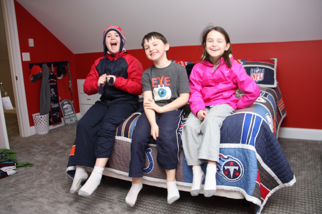 Our latest three musketeers adventure began at your house, with you showing us your new bedroom. It was built in the former attic - your bedroom on the right and a nice big playroom on the left. You could pick any color you wanted for your walls. That's Ben's favorite color too. You've got a special shelf bookcase for your Lego collection. I wish I had a bachelor pad like you!